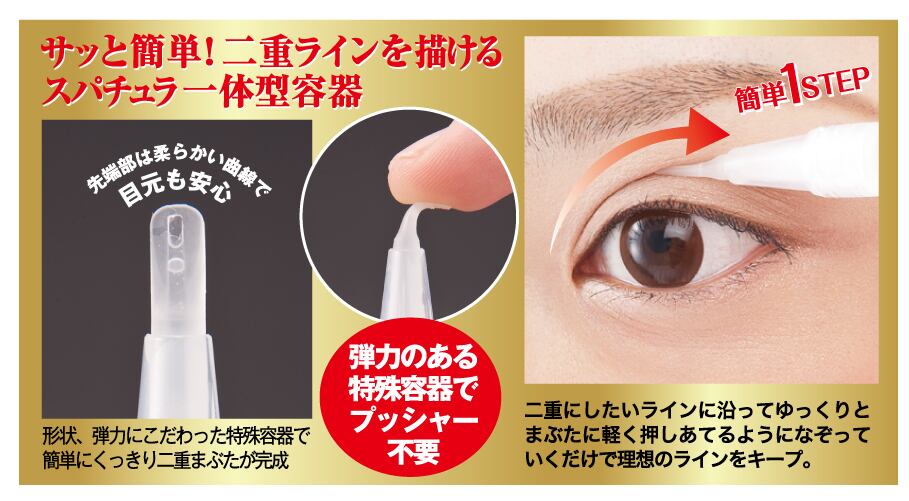自然な二重、長時間崩さない!描くだけカンタン、ワンステップで理想の二重に♪粘着成分が2倍になってパワーアップ。長時間の二重キープが実現します。わずかな時間でメジカラ抜群のパッチリ二重に変身☆3種類の美容成分プラセンタエキス、水溶性コラーゲン、ヒアルロン酸Naを配合。さらに13種類の植物性保湿成分も配合しました。弾力ある特殊容器でプレッシャーなく簡単くっきり二重まぶたが完成♪